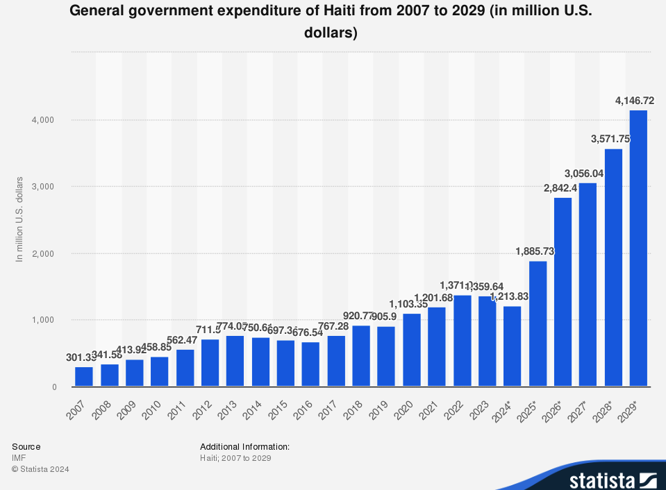 Haiti’s general government expenditure has been increasing over the past decade, reaching $1.88 billion in 2023. According to Statista, this figure is projected to grow to $4.1 billion by 2029, reflecting a 241.62% increase between 2024 and 2029. While rising expenditure could indicate efforts to improve infrastructure and services, many argue that critical sectors such as healthcare, education, and security remain underfunded.