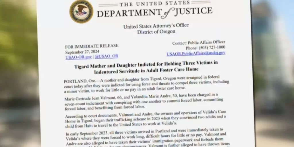 The operators of a Tigard adult care home face federal charges for allegedly coercing three Haitian immigrants, including a minor, into forced labor. Prosecutors accuse Marie Valmont and Yolandita Andre of using threats and intimidation to keep the victims working long hours with little or no pay.